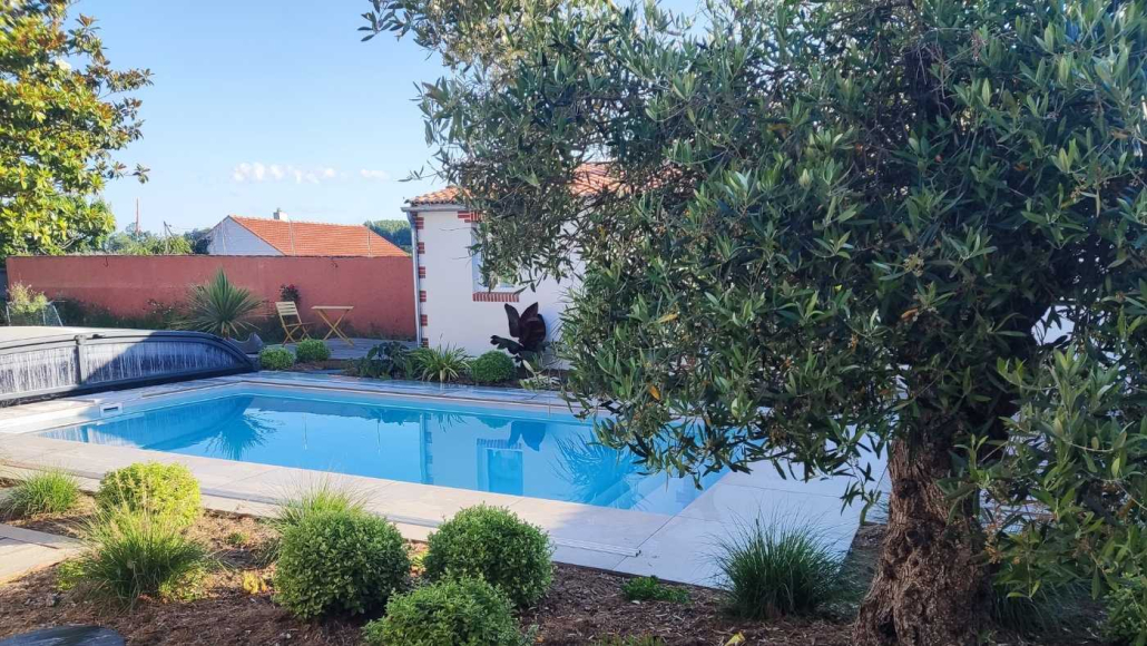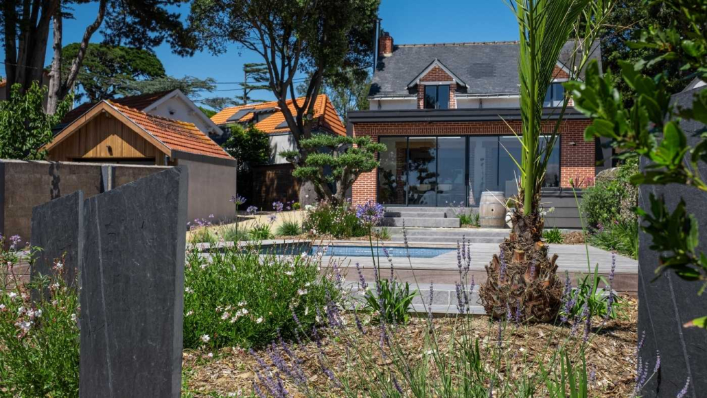 Jardin paysager contemporain aux Moutiers-en-Retz avec piscine, massifs fleuris, arbustes et palmiers, aménagement extérieur réalisé par Au Jardin des Rêves.